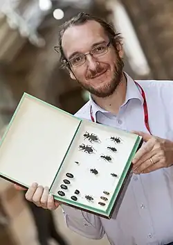 Barclay is best known for his work on beetles (Coleoptera), and is author of scientific papers and co-editor of a text book on the subject.[9] He worked as a volunteer in the Department of Entomology for several years before being offered the post of Curator in 2001.[10] The collection of the Natural History Museum that he manages includes more than 20,000 drawers of beetles, including specimens collected by Joseph Banks, Charles Darwin and Alfred Russel Wallace.[11] He has travelled extensively in search of specimens, including to Bolivia, Peru, Taiwan and Thailand,[12] and has discovered new species.