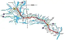 The McClellan–Kerr Arkansas River Navigation System (MKARNS) is part of the United States inland waterway system originating at the Tulsa Port of Catoosa and running southeast through Oklahoma and Arkansas to the Mississippi River. The total length of the system is 445 miles (716 km).[1] It was named for two senators, Robert S. Kerr (D-OK) and John L. McClellan (D-AR), who pushed its authorizing legislation through Congress. The system officially opened on June 5, 1971. President Richard M. Nixon attended the opening ceremony.[1] It is operated by the Army Corps of Engineers (USACE).[2]