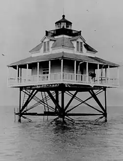 The shoal was first marked by the hull of the former revenue cutter McLane serving as a lightship beginning in 1847, but this was replaced by a screw-pile light in 1860. The light was extinguished by the Confederates but was undamaged, and was re-lit in 1863. The house was damaged by fire in 1880, and was utterly destroyed in 1883 by another fire; it was rebuilt the same year.[3] In 1932 it was automated, and in 1945 the house was removed and replaced by a skeleton tower on the same foundation.[4] This tower was damaged by the hurricanes of 2005 and was discontinued in 2007.[5]