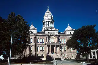The Miami County Courthouse is an historic building in Troy, Ohio, United States. Built from 1885 to 1888,[3] it was designed by noted Ohio (and later New York) architect Joseph W. Yost, who also designed the similar Belmont County Courthouse built at the same time in St. Clairsville. It has high arched windows and Corinthian columns supporting the outthrust corners and main entrance. A flight of stairs runs to the main entrance. The central pediment rests on an arch supported by Corinthian columns. The corners of the building thrust out and support a pediment, on top of each rests a tower crowned with an urn-shaped finial. A central tower rises from the middle of the building supporting the clock tower and dome, and a statue of justice stands at the very top.[1]
