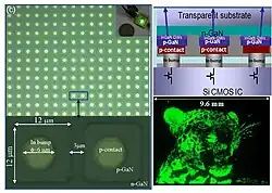 MicroLED, also known as micro-LED, mLED or μLED is an emerging flat-panel display technology consisting of arrays of microscopic LEDs forming the individual pixel elements. Inorganic semiconductor microLED (μLED) technology[1][2][3][4][5] was first invented in 2000 by the research group of Hongxing Jiang and Jingyu Lin of Texas Tech University (TTU) while they were at Kansas State University (KSU). The first high-resolution and video-capable InGaN microLED microdisplay in VGA format was realized in 2009 by Jiang, Lin and their colleagues at Texas Tech University and III-N Technology, Inc. via active driving of a microLED array by a complementary metal-oxide semiconductor (CMOS) IC.[6]