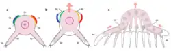 The purpose and development of Microdictyon's sclerotized plates remains a subject of debate. Some authors, beginning with Jerzy Dzik in 2003,[9] propose that based on a similar proposed method of sclerite growth and a similar morphology, these sclerites could be interpreted as large compound eyes, similar to phacopid trilobites[10] — this idea has been widely rejected.[11] The other proposals, that being defense and or muscle attachment, are viewed as much more plausible. Evidence from a small number of specimens, including both complete fossils from the Chengjiang as well as isolated microfossil plates, indicate that Microdictyon and other eoconchariids moulted their plates asynchronously, with the new, larger plates forming beneath the old ones, starting with the plates in the middle of the body and spreading to the anterior and posterior plates later. The new plates were not formed all at once, and the old plates remained overtop of the new ones for some time before the moult was completed, with the old cuticle rupturing along the dorsal surface, and the animal emerging with already hardened plates.[7][9][1] This is similar to the biphasic moulting of modern isopods (the posterior half of the body moults first, followed later by the anterior half), as opposed to most crustaceans, which moult their entire exoskeleton in a single step.[1]