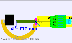 Animation of a micrometer in use. The object being measured is in black. The measurement is 4.140 ± 0.005 mm.