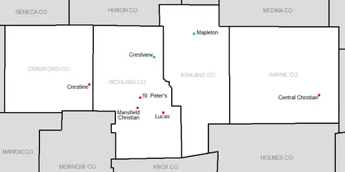 | Crestview | Cougars | Ashland (Weller Township, Richland County) | Red, White, Black |