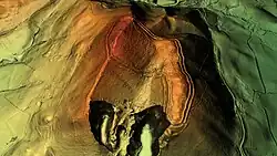The hillfort is very unusual in that the ramparts enclose two hills and the intervening valley. Bowden speculates that the spring within the valley "enhance[s] the position of the hillfort as a site of symbolic value".[3]