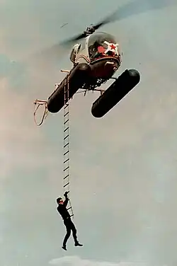 On the last day of shooting, the script called for Mitr, having vanquished the villains, to fly off into the sunset in a helicopter. As the camera rolled, Mitr leapt from the ground to grab a rope ladder hanging from the aircraft, only managing to reach the lowest rung. Unaware of this, the helicopter pilot flew higher, which led to Mitr losing his grip and falling 300 feet to his death. The accident was caught on film and was even left in the final theatrical release. The fatal fall has since been removed from DVD versions of the film, with Mitr simply flying off into the distance and some onscreen text paying tribute to him.