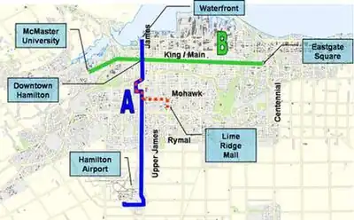 - Hamilton east-west LRT(Light Rail Transit) on King/Main Streets from Eastgate Mall to McMaster University