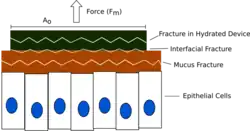 Mucoadhesion describes the attractive forces between a biological material and mucus or mucous membrane.[1] Mucous membranes adhere to epithelial surfaces such as the gastrointestinal tract (GI-tract), the vagina, the lung, the eye, etc. They are generally hydrophilic as they contain many hydrogen macromolecules due to the large amount of water (approximately 95%) within its composition. However, mucin also contains glycoproteins that enable the formation of a gel-like substance.[1] Understanding the hydrophilic bonding and adhesion mechanisms of mucus to biological material is of utmost importance in order to produce the most efficient applications. For example, in drug delivery systems, the mucus layer must be penetrated in order to effectively transport micro- or nanosized drug particles into the body.[2] Bioadhesion is the mechanism by which two biological materials are held together by interfacial forces. The mucoadhesive properties of polymers can be evaluated via rheological synergism studies with freshly isolated mucus, tensile studies and mucosal residence time studies. Results obtained with these in vitro methods show a high correlation with results obtained in humans.[3][4]