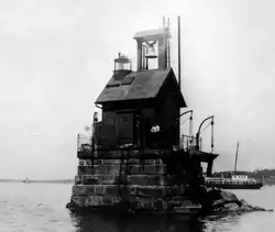 The shoals in this area were already marked by a stone daybeacon when the lighthouse board recommended construction of a light in 1871.[2] This followed some years of unsuccessful attempts to replace the lightship at Hog Island Shoal with a fixed light (the two shoals forming the edges of the channel leading into Mount Hope Bay).[3] Appropriation was made in 1873 and the first light was activated in August of the same year.[2] The form of the structure remained essentially the same over the years: a small square house with a lantern and fog bell set on the roof, all perched on a pier of stone blocks scarcely larger than the house itself. The building, however, had to be rebuilt or massively repaired several times over the years, due to damage from moving ice.[2] Damage to the pier in the winter of 1875 (the whole structure was shifted some four feet) led to enlargement of the pier in 1878, with the house being temporarily relocated to shore.[3] In 1920 the pier was again damaged by ice,[2] and four years later the house was rebuilt, the original single room dwelling being enlarged to four rooms.[3]