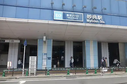 Myōden Station is managed by the Tokyo Metro Tozai Line. It is 26.8 km (16.7 mi) from the line's terminus at Nakano.