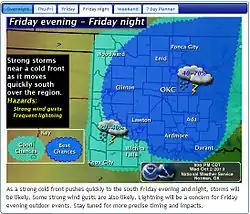 Among the features included by the Norman office's website is a localized forecast map that is accessible from its front page (similar to others that exist on the sites of other offices operating within the Southern Region Headquarters), which typically outlines current weather observations and forecasted weather conditions over the next two to five days within the Norman Forecast Area, and a diagram depicting a generalized seven-day forecast for the region (accessible through a selection of tabs which varies depending on the conditions expected). However, specialized maps are sometimes incorporated for expected hazardous weather events, including regionalized outlines of SPC-issued severe thunderstorm risk threats, and estimated precipitation amounts for upcoming and ongoing hydrological and winter weather events.[22]