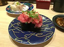 Negitoro is so named because it is a combination of negi (green onion) and toro, which is the fatty parts of tuna.[11] Since the 1980s, with the appearance of new toro sushi combined with pungent vegetables,[12] the well-matched taste and combination of toro, green onion and nori seaweed have become popular.[13]