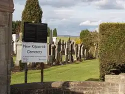 The original parish church was built in 1649 from local stone. This can be confirmed by the passing of an Act of the Scottish Parliament (in July 1649) in favour of the parishioners of New Kilpatrick and against one of the parish heritors, Sir Umphra Colquhoun of Balvie (now Mains). It seems that Colquhoun had agreed to the quarrying of stone from his land to build the church, but at some point during the building process (at least halfway), he had confiscated the workmen's tools and prevented the work from continuing by charging the workers with lawburrows. For this to be the case, Colquhoun must have argued that the work in some way caused him to fear for his safety, and the workers would have had to place a deposit with the court, which would be forfeited if they continued. Colquhoun lost the petition, and the church was completed.[20] The current New Kilpatrick Church was built in 1807, and subsequently enlarged in 1873–85 and in 1908. Electric lights were installed in 1923.[21] The church for many years placed assistant ministers within the parish at Netherton and Temple, Blairdardie, Drumchapel and Westerton.[22] The church is also one of the principal performing venues of the Bearsden Choir.