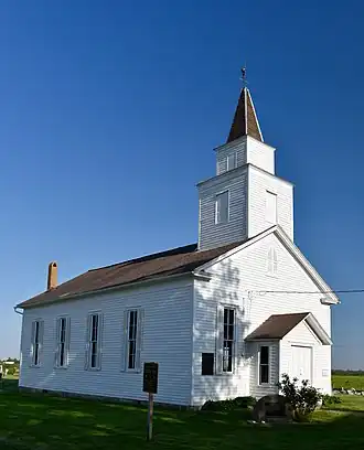 New Sweden Chapel is a historic Lutheran Church building located east of Fairfield, Iowa, United States in rural Jefferson County. The Swedish immigrant community that settled here was organized in 1845 under the leadership of Peter Cassel, a native of Kisa, Östergötland, Sweden. This was the first Swedish settlement in Iowa, as well as the first west of the Mississippi River.[2] They established a Lutheran congregation in 1848, and built a log church in 1851. This church replaced it in 1860. Local builder Henri Jagle was responsible for building the 50-by-30-foot (15.2 by 9.1 m) frame structure. It is four bays in length and features a 16-foot (4.9 m) tower with a spire over the main entrance. The interior features a painting by Olaf Grafström, who was an art instructor at Augustana College in Rock Island, Illinois. In 1948 the Augustana Evangelical Lutheran Church named the New Sweden Chapel as a National Synodial Shrine in recognition of its being the oldest congregation in the synod.[2] Prince Bertil of Sweden and the Archbishop of Uppsala participated in a ceremony that drew 3,000 people. The chapel no longer houses a regular congregation, but is used for special occasions. A cemetery is located on the church grounds. The chapel was listed on the National Register of Historic Places in 1977.[1]