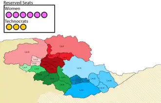 - ^ Six seats are reserved for women, three seats are reserved for technocrats.
