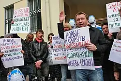 On 2 December 2007, Alexander Chuyev, who in 2007 initiated a bill in the State Duma to criminalize "propaganda of homosexuality", was not re-elected during the parliamentary elections.[40] On 5 December 2007, he admitted in the interview that the reason for his defeat was his homophobia. His bill to re-criminalize homosexuality was only rejected by the State Duma on 8 May 2009, on the eve of the 1st Slavic Pride in Moscow.[41][42][43]