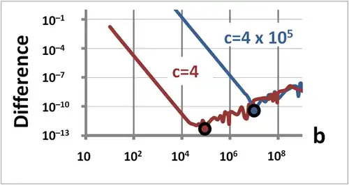 In the figure, Excel is used to find the smallest root of the quadratic equation x2 + bx + c = 0 for c = 4 and c = 4 × 105. The difference between direct evaluation using the quadratic formula and the approximation described above for widely spaced roots is plotted vs. b. Initially the difference between the methods declines because the widely spaced root method becomes more accurate at larger b-values. However, beyond some b-value the difference increases because the quadratic formula (good for smaller b-values) becomes worse due to round-off, while the widely spaced root method (good for large b-values) continues to improve. The point to switch methods is indicated by large dots, and is larger for larger c-values. At large b-values, the upward sloping curve is Excel's round-off error in the quadratic formula, whose erratic behavior causes the curves to squiggle.