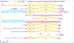 10 splice isoforms that encode good proteins, altogether 8 different isoforms, 2 of which are complete isoforms. The image below shows the 10 isoforms that are predicted.[15] Of these 10 splice isoforms, 8 have varying peptide lengths, however all of these proteins are only hypothetical with no extensive research done on them.[15]