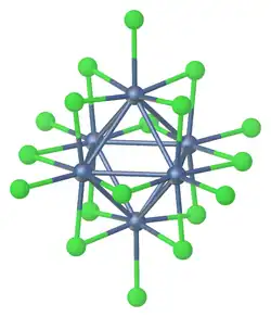 With metals in group 4 or 5 a so-called edge-capped octahedral clusters are more common. Twelve halides are located along the edge of the octahedron and six are terminal. Examples of this structure type are tungsten(III) chloride, Ta6Cl14(H2O)4,[5][6] Nb6F15, and Nb6F182−.[1]