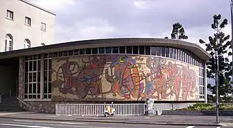 In 1958 national competitions were held for designs for a wall mural and sculpture to embellish the exterior of the new Centennial Hall. These were won by Victorian artist Lindsay Edward[6] for his glass mosaic mural, and Brisbane sculptor Leonard George Shillam. Shillam's aluminium sculpture 'Enlightenment' showed three symbolic figures reaching towards the rays of the sun, representing 'the dissemination of enlightenment to mankind - the function of a library as an instrument of enlightenment'.[7][8] It was cast by the Non-Ferrous Foundry of Brisbane.[1]