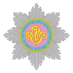 - Insignia consists of a pendant only. The pendant design is similar to that for a Knight Commander, but of smaller size. It is suspended from a pink silk band 4 cm wide, with an additional rosette, to wear on the left chest.