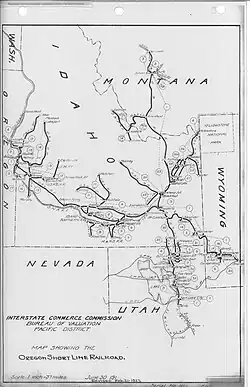 The Oregon Short Line Railway was organized on April 14, 1881. The line started from the Union Pacific main line in Granger, Wyoming, and reached Montpelier, Idaho, on August 5, 1882, and then to McCammon, Idaho, in the Fall of 1882. Between McCammon and Pocatello, Idaho, the line was shared with fellow Union Pacific subsidiary Utah & Northern's grade by adding a third rail to the 3 ft (914 mm) narrow gauge track to accommodate the 4 ft 8+1⁄2 in (1,435 mm) standard gauge cars. The line from Pocatello to Huntington, Oregon, was completed in late 1884.[2] Access to Portland, Oregon, was on track leased from the Oregon Railway and Navigation Company.[3]