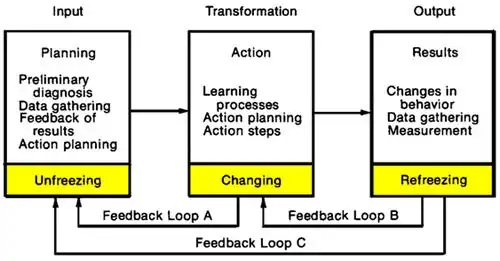 The second stage of action research is the action, or transformation, phase. This stage includes actions relating to learning processes (perhaps in the form of role analysis) and to planning and executing behavioral changes in the client organization. As shown in Figure 1, feedback at this stage would move via Feedback Loop A and would have the effect of altering previous planning to bring the learning activities of the client system into better alignment with change objectives. Included in this stage is action-planning activity carried out jointly by the consultant and members of the client system. Following the workshop or learning sessions, these action steps are carried out on the job as part of the transformation stage.[7]