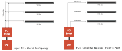 Conceptually, the PCI Express bus is a high-speed serial replacement of the older PCI/PCI-X bus.[8] One of the key differences between the PCI Express bus and the older PCI is the bus topology; PCI uses a shared parallel bus architecture, in which the PCI host and all devices share a common set of address, data, and control lines. In contrast, PCI Express is based on point-to-point topology, with separate serial links connecting every device to the root complex (host). Because of its shared bus topology, access to the older PCI bus is arbitrated (in the case of multiple masters), and limited to one master at a time, in a single direction. Furthermore, the older PCI clocking scheme limits the bus clock to the slowest peripheral on the bus (regardless of the devices involved in the bus transaction). In contrast, a PCI Express bus link supports full-duplex communication between any two endpoints, with no inherent limitation on concurrent access across multiple endpoints.