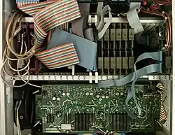 A PDP–11/03 with cover removed to show the CPU board, with memory board beneath (Two of the CPU chipset's four 40-pin packages have been removed, and the optional FPU is also missing.)