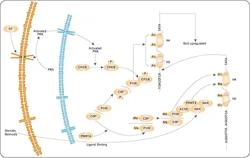 Protein arginine N-methyltransferase-4 (PRMT4/CARM1)[1][2][3] methylation of arginine residues within proteins plays a critical key role in transcriptional regulation (see the PRMT4 pathway on the left). PRMT4 binds to the classes of transcriptional activators known as p160 and CBP/p300.[4] The modified forms of these proteins are involved in stimulation of gene expression via steroid hormone receptors. Significantly, PRMT4 methylates core histones H3 and H4, which are also targets of the histone acetylase activity of CBP/p300 coactivators. PRMT4 recruitment of chromatin by binding to coactivators increases histone methylation and enhances the accessibility of promoter regions for transcription. Methylation of the transcriptional coactivator CBP by PRMT4 inhibits binding to CREB and thereby partitions the limited cellular pool of CBP for steroid hormone receptor interaction.
