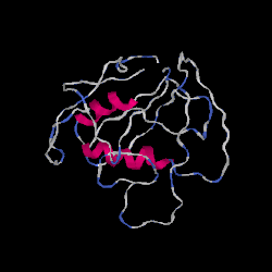 The secondary structure is characterized by high confidence in the presence of an alpha helix from amino acid 43 to 70 with the rest consisting of coils.[18] In terms of tertiary structure, predictive tools returned low confidence in all sections of the protein besides the core alpha helix.[19]