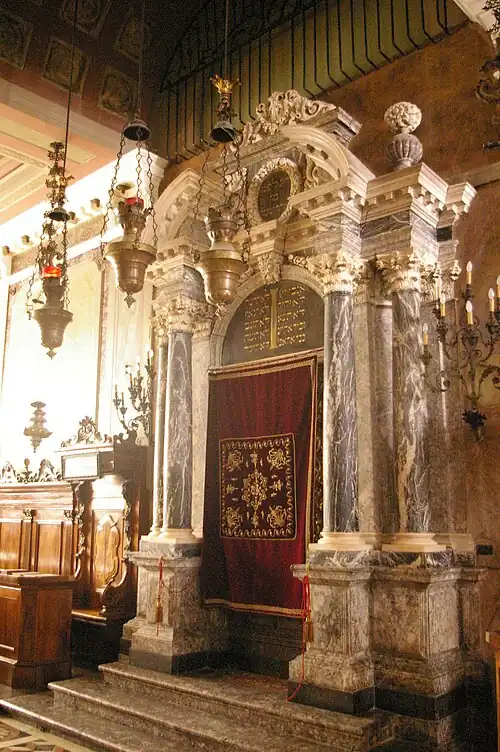 The baroque, sixteenth century Torah Ark is made from the wood of a plane tree that was struck down by lightning in the University's famous botanical garden. It features gilded doors, four Corinthian columns made of black marble with white veining, and carved foliage. The balduchin is in the form of a broken pediment.[2]