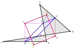 | Petr–Douglas–Neumann theorem as applied to a self-intersecting quadrilateral A0 = ABCD. A1 = EFGH is constructed using apex angle π/2 and A2 = PQRS with apex angle π. |