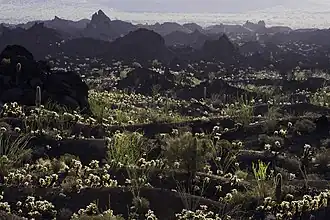 A variety of flora and fauna occur in the Pinacate Mountains, including the sculptural Elephant Tree, and Bursera microphylla.[3]