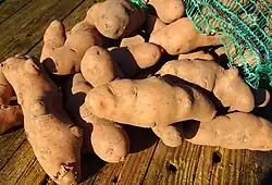 The Pink Fir Apple potato is a maincrop potato variety with a long knobbly shape, pink skin, and creamy waxy flesh.[1] Its shape makes it difficult to peel,[2] unless boiled before peeling.