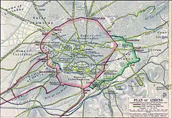 ![]() Acropolis of Athens, a noted polis of Classical Greece. The polis was the whole city, which had its own walls. Shown is a part of the polis, the akropolis, "city heights", which was never alone regarded as its own city. The origins of the settlement are lost in prehistoric times. Also included in the classical Athenian polis were suburban locations in the region of Attica, such as the port, Piraeus. | |