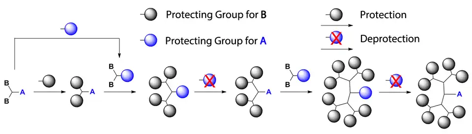 - Note that the black protecting groups for group B represent what will become the outermost layer of the final molecule, and remain attached throughout the synthetic process; their purpose is to guarantee that propagation of dendrimer growth can take place in a controlled fashion by preventing unwanted side reactions.