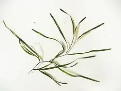Potamogeton compressus produces a strongly flattened, robust, branching stem up to 90 cm in maximum length.[4] It grows annually from turions and seed, producing bushy plants branching near the surface with long, rather grass-like leaves that are 85–240 mm long and 3–6 mm wide and olive-green or dark green, sometimes with a reddish tinge near the surface.[4] Each leaf has two veins either side of the midrib and is bluntly pointed. The leaves have a rather opaque appearance compared to the transparent leaves of most pondweeds due to the presence of fibres called sclerenchymatous strands. There are no rhizomes or floating leaves.