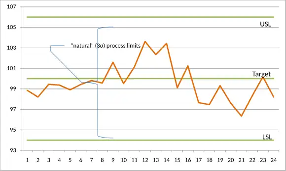 Consider a quality characteristic with a target of 100.00 μm and upper and lower specification limits of 106.00 μm and 94.00 μm, respectively. If, after carefully monitoring the process for a while, it appears that the process is out of control and producing output unpredictably (as depicted in the run chart below), one can't meaningfully estimate its mean and standard deviation. In the example below, the process mean appears to drift upward, settle for a while, and then drift downward.
