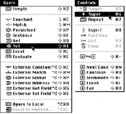 Prograph took these concept further, introducing a combination of object-oriented methodologies and a completely visual environment for programming. Objects are represented by hexagons with two sides, one containing the data fields, the other the methods that operate on them. Double-clicking on either side would open a window showing the details for that object; for instance, opening the variables side would show class variables at the top and instance variables below. Double-clicking the method side shows the methods implemented in this class, as well as those inherited from the superclass. When a method itself is double-clicked, it opens into another window displaying the logic.