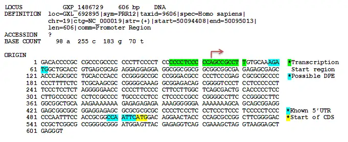 The promoter region of PRR12 was predicted using ElDorado at Genomatix.[12] The region starts at position 50094408 and ends at 50095013 of chromosome 19. This promoter set is conserved in the macaque, mouse, rat, horse, cow, pig, dog and zebrafish. No recognizable TATA box, B recognition element (BRE), or CAAT box was found upstream of the predicted transcription start region. Because no clear TATA box was found, it is possible that PRR12 is regulated by a TATA-less promoter containing a downstream promoter element (DPE). However, the predicted DPE is only 15bp downstream of the transcription start region instead of the typical +25 to +32 base pairs. More research will be required to expand the 5' UTR of the PRR12 transcript in order to confirm where the correct promoter region is located.