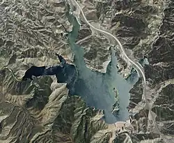 ![]() Satellite view of dam and reservoir. Interstate 5 is on the right of the image. | |