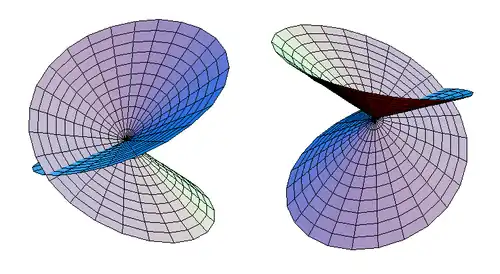 Now consider the rims of the disks (with v = 1). The points on the rim of the self-intersecting disk come in pairs which are reflections of each other with respect to the plane z = 0.