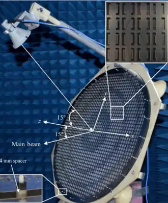 A reflectarray antenna (or just reflectarray) consists of an array of unit cells, illuminated by a feeding antenna (source of electromagnetic waves).[1][2] The feeding antenna is usually a horn. The unit cells are usually backed by a ground plane, and the incident wave reflects off them towards the direction of the beam, but each cell adds a different phase delay to the reflected signal. A phase distribution of concentric rings is applied to focus the wavefronts from the feeding antenna into a plane wave (to account for the varying path lengths from the feeding antenna to each unit cell). A progressive phase shift can be applied to the unit cells to steer the beam direction.[3] It is common to offset the feeding antenna to prevent blockage of the beam.[4] In this case, the phase distribution on the reflectarray surface needs to be altered. A reflectarray focuses a beam in a similar way to a parabolic reflector (dish), but with a much thinner form factor.