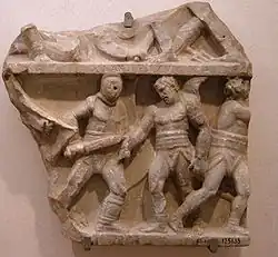 Roman gladiators fell into stock categories modelled on real-world precedents.[1] Almost all of these classes were based on military antecedents; the retiarius ("net-fighter" or "net-man"),[2][3] who was themed after the sea, was one exception.[4] Rare gladiator fights were staged over water; these may have given rise to the concept of a gladiator based on a fisherman. Fights between differently-armed gladiators became popular in the Imperial period;[5] the retiarius versus the scaly secutor developed as the conflict of a fisherman with a stylised fish. The earlier murmillones had borne a fish on their helmets;[6] the secutores with their scaly armour evolved from them. However, because of the stark differences in arms and armour between the two types, the pairing pushed such practices to new extremes. Roman art and literature make no mention of retiarii until the early Imperial period; for example, the type is absent from the copious gladiator-themed reliefs dating to the 1st century found at Chieti and Pompeii.[5] Nevertheless, graffiti and artifacts from Pompeii attest to the class's existence by this time.[7] Fights between retiarii and secutores probably became popular as early as the middle of the 1st century CE; the net-fighter had become one of the standard gladiator categories by the 2nd or 3rd century CE and remained a staple attraction until the end of the gladiatorial games.[8] In addition to the man-versus-nature symbolism inherent in such bouts,[9] the lightly armoured retiarius was viewed as the effeminate counterpoint to the manly, heavily armoured secutor.[9] The retiarius was also seen as water to the secutor's fire, one constantly moving and escaping, the other determinedly inescapable.[10] Another gladiator type, the laquearius ("noose-man"), was similar to the retiarius but fought with a lasso in place of a net.[11]