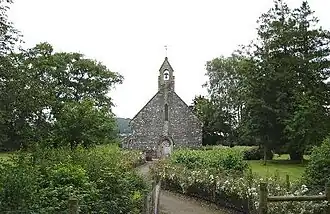 Colonel William Salusbury (1580–1660), affectionately known as Hen Hosanau Gleision "Old Blue Stockings", was a colourful character famed for his part as a Royalist in the defence of Denbigh Castle in the English Civil War. Although a warrior in early years, he later became a successful writer of Welsh verse and was noted for his “high church” views. In 1637 he had a private chapel built in collaboration with Bishop William Morgan, who was sympathetic to Salisbury's views and the first translator of the Bible into Welsh. The resulting chapel, dedicated to The Holy Trinity, is quite plain and unremarkable to external view. A small construction in stone, it consists of a simple nave/chancel with access through a timber arched door at the west end of the church into an extremely small porch and a door and porch at the north chancel wall for the use of the minister. Above the west door is a single external bell.