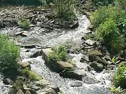 Flows on the Savick Brook vary considerably, from as little as 110 cubic feet per minute (50 L/s) up to 74,000 cubic feet per minute (35 m3/s). In order to accommodate these flows, weirs which are up to 100 feet (30 m) wide were required at the locks, and the bypass channels generally use the original course of the brook.[15] In order to allow fish to continue to move along the watercourse, fish passes would be built into the weirs. The Environment Agency raised concerns about water quality, but these were withdrawn in March 1999 after North West Water announced that they would soon be building a new interceptor sewer to run close to the Savick Brook, and the Trust agreed to make the channel slightly narrower, to improve flow speeds.[16] When originally conceived, the navigation would have had eight locks, numbered 1 to 8 from the Ribble upwards. Lock 2A was added, to ensure that the level of the pound above lock 2 did not compromise land drainage in the locality.[15] The locks were subsequently renumbered 1 to 9 from the Lancaster Canal downwards, in order to follow the convention used on the Glasson Dock branch. (Care should be taken when reading source documents on the construction, which use the old order).[17]
