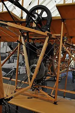 Roe had originally intended to use a four-cylinder inline engine which J.A. Prestwich were developing but this failed when bench-tested by Prestwich, so Roe initially installed the 6 horsepower (hp) JAP engine from his previous aircraft.[2] Taxying trials with this engine were begun in April 1909. At the end of May a new 9 hp (7 kW) JAP engine was delivered, and after fitting this a series of brief flights of around 50 ft (15 m) were made, beginning on 5 June.[3] During these flights Roe experimented with different reduction ratios between the engine and propeller and also with varying pitch settings for the propeller blades, which could be adjusted between flights. On 13 July, he achieved a flight of 100 ft (30 m), and ten days later one of 900 ft (270 m).[1] Over the next two months further successful flights were made and the aircraft was modified slightly: the drive belt was replaced by a chain, the vertical tail surfaces were removed and both the engine and pilot's seat were moved forwards.