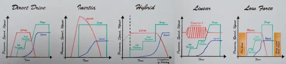 Chart comparison in several friction welding methods.[26][27] - may depend on the version of the process: direct-drive, inertia friction welding, hybrid welding,[9]