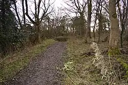 During the construction of the Grand Union Canal where it flows through Boxmoor, the navvies who carried out the work lived on an encampment at Roughdown Common.[7] The navvies where not the only group that made use of the Common; in 1809 a Good Friday funfair was held in the chalk pit,[8] while 1939 saw the first recorded football match on the site, played by young evacuees from London.[9] The war theme continued in 1946 when prisoners of war - who were based in a P.O.W. camp at nearby Howes Retreat - cleared scrub at the site.[10]